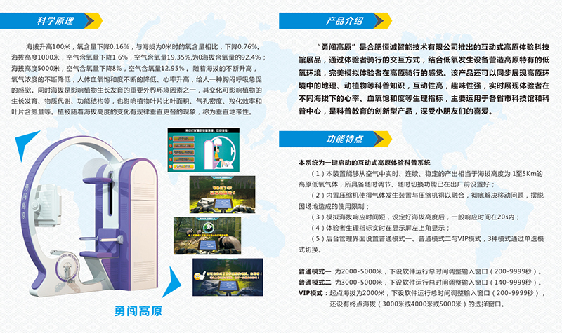 作為國內智能低氧產學研一體化標桿企業(yè),我司攜國內首創(chuàng)互動式高原體驗科普系統(tǒng)系列產品“勇闖高原”和“魔幻高原”亮相展會。