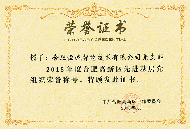 恒誠智能黨支部榮獲“2018年度合肥高新區(qū)先進基層黨組織”榮譽稱號