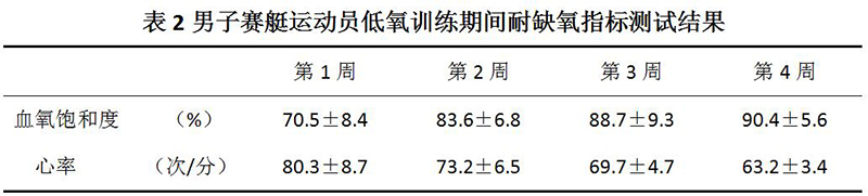 選擇2000m的海拔氧濃度對(duì)隊(duì)員進(jìn)行5分鐘耐缺氧測(cè)試,測(cè)試指標(biāo)為血氧飽和度和心率。